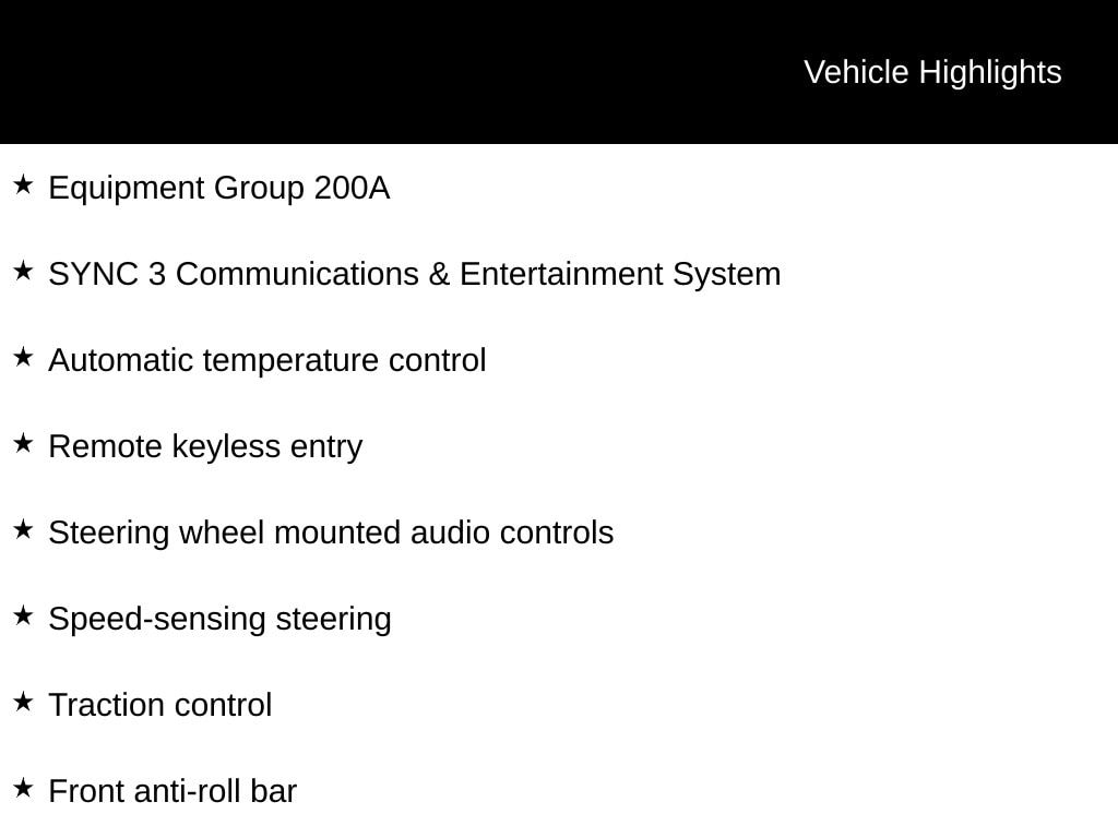 4-Wheel Disc Brakes, ABS brakes, Alloy wheels, AppLink/Apple CarPlay and Android Auto, Automatic temperature control, Brake assist, Delay-off headlights, Dual front impact airbags, Dual front side impact airbags, Electronic Stability Control, Emergency communication system: SYNC 3 911 Assist, Equipment Group 200A, Exterior Parking Camera Rear, Front anti-roll bar, Front fog lights, Front wheel independent suspension, Fully automatic headlights, Heated front seats, Illuminated entry, Knee airbag, Leather Shift Knob, Leather steering wheel, Low tire pressure warning, Occupant sensing airbag, Overhead airbag, Panic alarm, Power door mirrors, Power moonroof, Rear anti-roll bar, Rear Parking Sensors, Rear side impact airbag, Remote keyless entry, Speed control, Speed-sensing steering, Steering wheel mounted audio controls, SYNC 3 Communications & Entertainment System, Traction control, Turn signal indicator mirrors, Unique Cloth Heated Front Bucket Seats, Wheels: 16" Shadow Silver-Painted Aluminum.