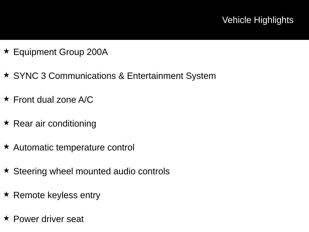 4WD, 1st Row Heated Seats, 3rd row seats: bench, 4-Wheel Disc Brakes, ABS brakes, Alloy wheels, Auto High-beam Headlights, Automatic temperature control, Brake assist, Delay-off headlights, Dual front impact airbags, Dual front side impact airbags, Electronic Stability Control, Emergency communication system: SYNC 3 911 Assist, Equipment Group 200A, Exterior Parking Camera Rear, Four wheel independent suspension, Front anti-roll bar, Front dual zone A/C, Fully automatic headlights, Heated door mirrors, Heated front seats, Illuminated entry, Knee airbag, Leather steering wheel, Low tire pressure warning, Occupant sensing airbag, Overhead airbag, Panic alarm, Power door mirrors, Power driver seat, Power Liftgate, Rear air conditioning, Rear anti-roll bar, Remote keyless entry, Security system, Speed control, Speed-sensing steering, Split folding rear seat, Steering wheel mounted audio controls, SYNC 3 Communications & Entertainment System, Traction control, Wheels: 18" 5-Spoke Sparkle Silver-Painted Alum.