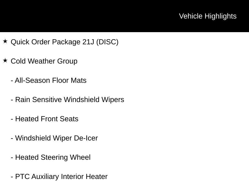 16" x 6.5" Aluminum Wheels, 4-Wheel Disc Brakes, ABS brakes, All-Season Floor Mats, Alloy wheels, Anti-whiplash front head restraints, Brake assist, Cold Weather Group, Delay-off headlights, Dual front impact airbags, Dual front side impact airbags, Electronic Stability Control, Four wheel independent suspension, Front anti-roll bar, Front fog lights, Fully automatic headlights, Heated door mirrors, Heated Front Seats, Heated Steering Wheel, Illuminated entry, Knee airbag, Leather steering wheel, Low tire pressure warning, Occupant sensing airbag, Overhead airbag, ParkView Rear Back-Up Camera, Passenger vanity mirror, Power door mirrors, PTC Auxiliary Interior Heater, Quick Order Package 21J (DISC), Radio: Uconnect 3 w/5" Display, Rain Sensitive Windshield Wipers, Rear anti-roll bar, Remote keyless entry, Speed control, Steering wheel mounted audio controls, Tachometer, Traction control, Windshield Wiper De-Icer.