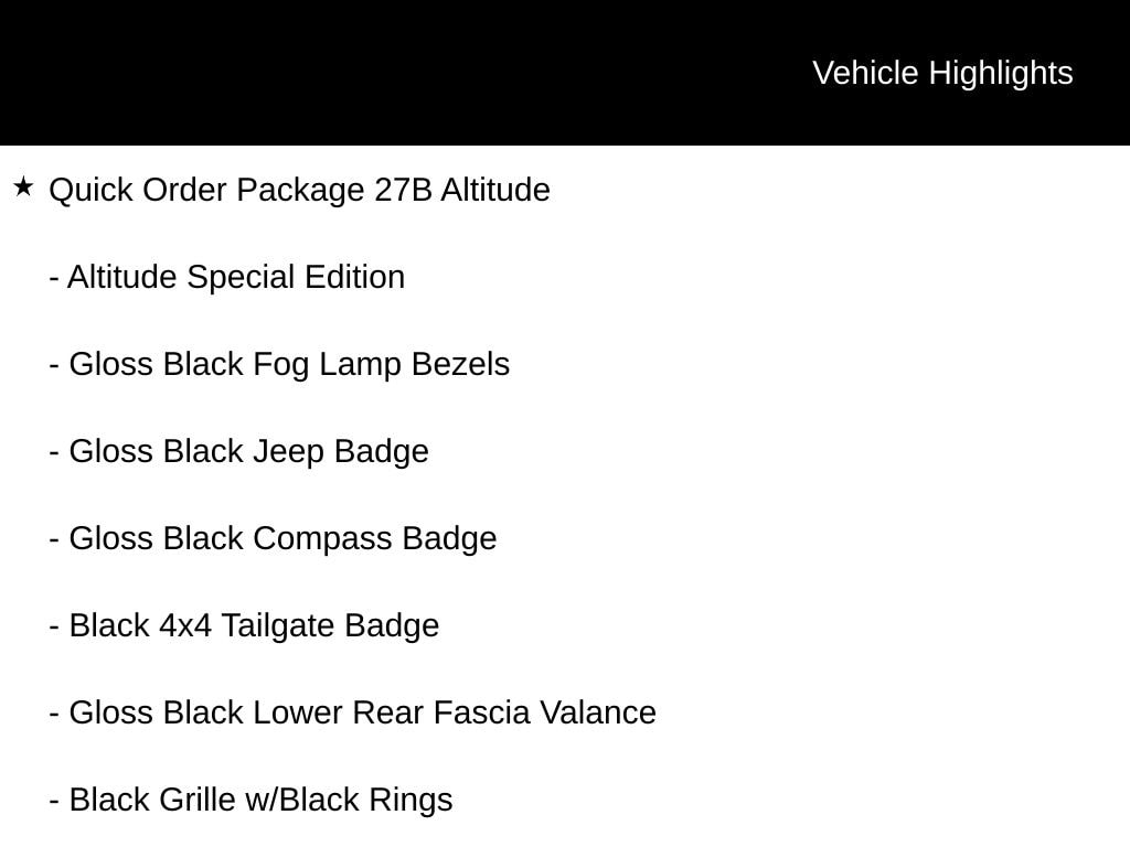 4WD, 115V Auxiliary Power Outlet, 4-Way Power Lumbar Adjust, 4-Wheel Disc Brakes, 7.0" Touch Screen Display, ABS brakes, All-Season Floor Mats, Alloy wheels, Altitude Special Edition, Anti-whiplash front head restraints, Auto-Dimming Rear-View Mirror, Black 4x4 Tailgate Badge, Black Day Light Opening Moldings, Black Grille w/Black Rings, Black Roof, Brake assist, Bright Exhaust Tip, Cluster 7.0" Color Driver Info Display, Cold Weather Group, Delay-off headlights, Dual front impact airbags, Dual front side impact airbags, Electronic Stability Control, Four wheel independent suspension, Front anti-roll bar, Front fog lights, Fully automatic headlights, Gloss Black Compass Badge, Gloss Black Fog Lamp Bezels, Gloss Black Jeep Badge, Gloss Black Lower Rear Fascia Valance, Heated door mirrors, Heated Front Seats, Heated Steering Wheel, Illuminated entry, Knee airbag, Low tire pressure warning, Occupant sensing airbag, Outside temperature display, Overhead airbag, Panic alarm, ParkView Rear Back-Up Camera, Piano Black Interior Accents, Popular Equipment Group, Power 8-Way Driver/Manual 6-Way Passenger Seats, Power Front/Fixed Rear Full Sunroof, Quick Order Package 27B Altitude, Rear anti-roll bar, Remote keyless entry, Reversible Carpet/Vinyl Cargo Mat, Speed control, Steering wheel mounted audio controls, Traction control, Wheels: 18" x 7.0" Black Aluminum, Windshield Wiper De-Icer.