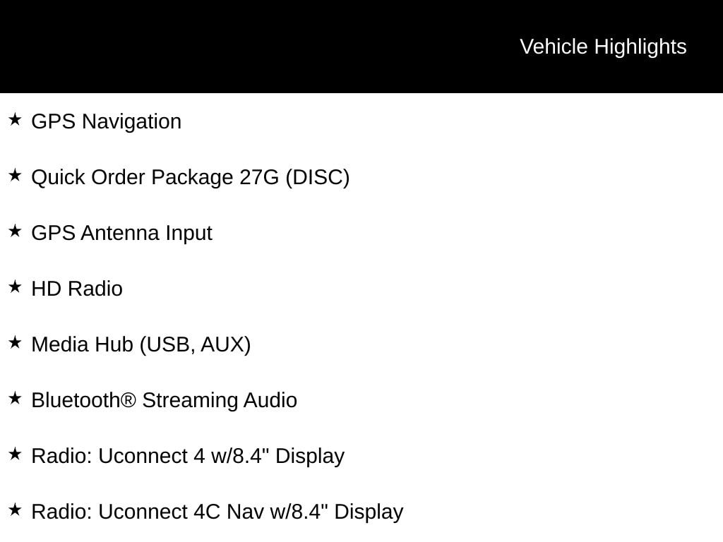 4WD, 1-Year SiriusXM Guardian Trial, 4-Wheel Disc Brakes, 8.4" Touch Screen Display, ABS brakes, Alloy wheels, Anti-whiplash front head restraints, Apple CarPlay, Apple CarPlay/Android Auto, Auto-dimming Rear-View mirror, Automatic temperature control, Bluetooth Integrated Voice Command, Bluetooth® Streaming Audio, Brake assist, Delay-off headlights, Dual front impact airbags, Dual front side impact airbags, Electronic Stability Control, Four wheel independent suspension, Front anti-roll bar, Front dual zone A/C, Front fog lights, Fully automatic headlights, Google Android Auto, GPS Antenna Input, GPS Navigation, HD Radio, Heated door mirrors, Heated front seats, Heated steering wheel, Illuminated entry, Knee airbag, Leather Shift Knob, Leather Trimmed Bucket Seats, Low tire pressure warning, Media Hub (USB, AUX), Occupant sensing airbag, Overhead airbag, Panic alarm, ParkView Rear Back-Up Camera, Power Front/Fixed Rear Full Sunroof, Quick Order Package 27G (DISC), Radio: Uconnect 4 w/8.4" Display, Radio: Uconnect 4C Nav w/8.4" Display, Rear anti-roll bar, Remote keyless entry, Security system, SiriusXM Traffic Plus, SiriusXM Travel Link, Steering wheel mounted audio controls, Traction control, Turn signal indicator mirrors, USB Host Flip, Wheels: 19" x 7.5" Polished/Black Pockets Aluminum.