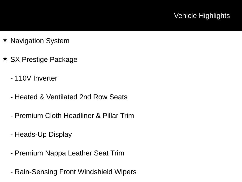 10 Speakers, 110V Inverter, 3rd row seats: split-bench, 4-Wheel Disc Brakes, ABS brakes, Alloy wheels, Apple CarPlay & Android Auto, Auto High-beam Headlights, Auto-dimming Rear-View mirror, Automatic temperature control, Brake assist, Delay-off headlights, Dual front impact airbags, Dual front side impact airbags, Electronic Stability Control, Emergency communication system: 911 Connect, Four wheel independent suspension, Front anti-roll bar, Front dual zone A/C, Front fog lights, Fully automatic headlights, harman/kardon® Speakers, Heads-Up Display, Heated & Ventilated 2nd Row Seats, Heated & Ventilated Front Bucket Seats, Heated door mirrors, Heated front seats, Heated steering wheel, Illuminated entry, Illuminated Scuff Plates, Knee airbag, Leather Seat Trim, Leather Shift Knob, Leather steering wheel, Low tire pressure warning, Memory seat, Multicolored Interior Light Kit, Navigation System, Occupant sensing airbag, Overhead airbag, Panic alarm, Power door mirrors, Power driver seat, Power Liftgate, Power moonroof, Power steering, Power windows, Premium Cloth Headliner & Pillar Trim, Premium Nappa Leather Seat Trim, Radio: AM/FM harman/kardon Audio System, Rain-Sensing Front Windshield Wipers, Rear air conditioning, Rear anti-roll bar, Rear audio controls, Remote keyless entry, Security system, Self Leveling Rear Suspension, Smart Key w/ Push Button and Remote Start, Speed control, Speed-sensing steering, Steering wheel mounted audio controls, SX Dune Brown Nappa Leather Seats, SX Prestige Package, Tow Hitch w/Harness (TOF), Towing Package, Traction control, Turn signal indicator mirrors, Wheels: 20" x 7.5" Black Alloy.
