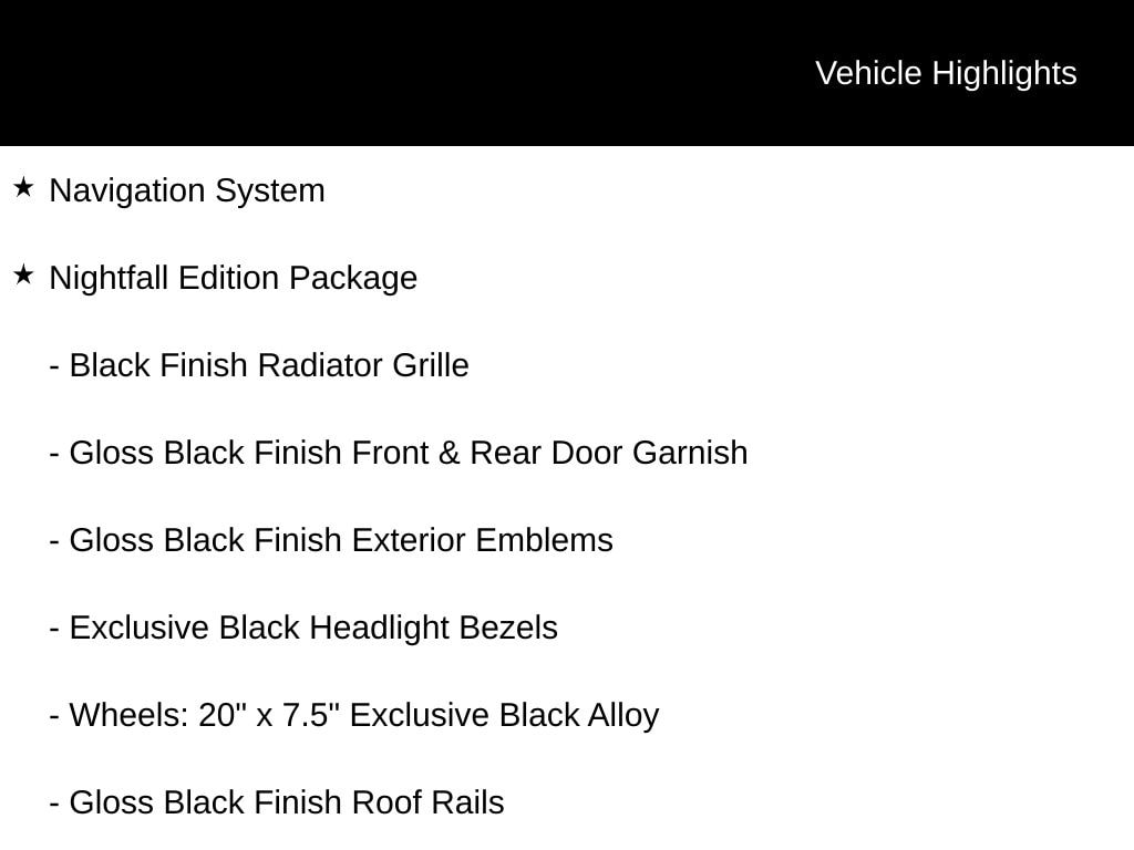 20" x 7.5" Machined Alloy Wheels, 2nd Row Captain Chairs, 3rd row seats: split-bench, 4-Wheel Disc Brakes, ABS brakes, Alloy wheels, Apple CarPlay & Android Auto, Auto-dimming Rear-View mirror, Automatic temperature control, Black Finish Radiator Grille, Brake assist, Delay-off headlights, Dual front impact airbags, Dual front side impact airbags, Electronic Stability Control, Emergency communication system: 911 Connect, EX Premium Package, Exclusive Black Headlight Bezels, Four wheel independent suspension, Front & Rear Gloss Black Finish Bumper Skid Plates, Front anti-roll bar, Front dual zone A/C, Fully automatic headlights, Gloss Black Finish Exterior Emblems, Gloss Black Finish Front & Rear Door Garnish, Gloss Black Finish Roof Rails, Heated & Ventilated Front Bucket Seats, Heated door mirrors, Heated front seats, Heated steering wheel, Illuminated entry, Knee airbag, Leather Seat Trim, Leather Shift Knob, Leather steering wheel, LED Headlamps, Low tire pressure warning, Navigation System, Nightfall Edition Package, Occupant sensing airbag, Overhead airbag, Panic alarm, Power door mirrors, Power driver seat, Power Liftgate, Power moonroof, Radio: AM/FM Display Audio System, Rear air conditioning, Rear anti-roll bar, Remote keyless entry, Satin Chrome Roof Rails, Security system, Self Leveling Rear Suspension, Smart Key w/ Push Button and Remote Start, Speed control, Speed-sensing steering, Steering wheel mounted audio controls, Tow Hitch w/Harness (TOF), Towing Package, Traction control, Turn signal indicator mirrors, Ventilated front seats, Wheels: 20" x 7.5" Exclusive Black Alloy.