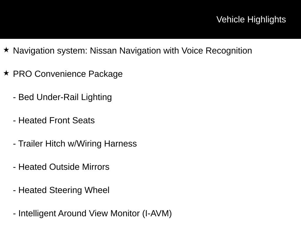 4WD, 120V Power Outlet in Bed, 120V Power Outlet in Rear Center Console, 17" Accessory Dark Beadlock Style Alloy Wheels, 4-Wheel Disc Brakes, ABS brakes, Alloy wheels, Anti-whiplash front head restraints, Auto-Dimming Mirror, Auto-Tilt & Slide Sunroof w/Manual Shade, Automatic temperature control, Bed Under-Rail Lighting, Brake assist, Delay-off headlights, Electronic Stability Control, Fender Premium Audio System w/10 Speakers, Front & Rear Leather Seat Trim (1st/2nd Rows), Front anti-roll bar, Front dual zone A/C, Front fog lights, Front wheel independent suspension, Fully automatic headlights, Heated Front Seats, Heated Outside Mirrors, Heated Steering Wheel, HomeLink UGDO, Illuminated entry, Intelligent Around View Monitor (I-AVM), Low tire pressure warning, Navigation system: Nissan Navigation with Voice Recognition, Off-Road Protection Package, Panic alarm, Partial Under-Seat Storage Delete, Power door mirrors, PRO Convenience Package, PRO-4X Premium Package, Radio data system, Rear anti-roll bar, Rear step bumper, Remote Engine Starter, Remote keyless entry, Security system, Speed control, Speed-sensing steering, Spray-In Bedliner, Steering wheel mounted audio controls, Tilt steering wheel, Tow Package: Hitch, Tow Harness, Traction control, Trailer Hitch w/Wiring Harness, Utili-Track System, Wireless Charging For Personal Devices.