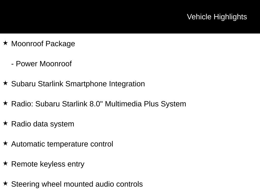 18" Alloy Wheels, 4-Wheel Disc Brakes, ABS brakes, Alloy wheels, Auto High-beam Headlights, Auto-Dimming Exterior Mirror w/Approach Light, Auto-Dimming Mirror w/Compass, Automatic temperature control, Brake assist, Dual front impact airbags, Dual front side impact airbags, Electronic Stability Control, Emergency communication system: STARLINK Safety and Security (Subscription Required), Exterior Parking Camera Rear, Four wheel independent suspension, Front anti-roll bar, Front fog lights, Fully automatic headlights, Heated door mirrors, Heated Front Bucket Seats, Illuminated entry, Knee airbag, Leather-Trimmed Upholstery, Low tire pressure warning, Moonroof Package, Occupant sensing airbag, Overhead airbag, Panic alarm, Power door mirrors, Power driver seat, Power Moonroof, Power steering, Power windows, Radio data system, Radio: Subaru Starlink 8.0" Multimedia Plus System, Rear anti-roll bar, Rear Bumper Cover, Remote keyless entry, Security system, Speed control, Speed-sensing steering, Split folding rear seat, Steering wheel mounted audio controls, Subaru Starlink Smartphone Integration, Tilt steering wheel, Traction control, Turn signal indicator mirrors.